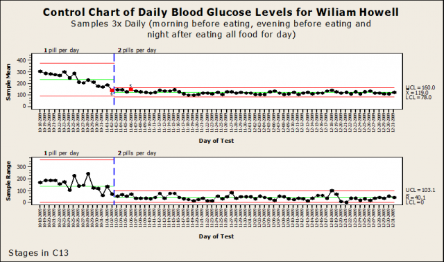 In my last post, I discussed how quality professional Bill Howell chose to manage his diabetes diagnosis by treating it as a Six Sigma project. Since a key metric in controlling his disease was keeping his blood glucose levels below 125 mg/dL, he tested his blood using a meter three times per day and then charted his data to see how his levels changed over time. He ensured his measurement systems were producing reliable data, and assessed the potential causes for his increased blood glucose levels. He then chose to focus on the causes he could control and analyze himself.