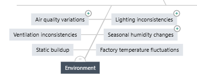 They used a Man, Machine, Materials, Method, and Environment fishbone diagram in the Brainstorm utility within Minitab Solution Center to identify potential causes. Here’s their initial diagram: