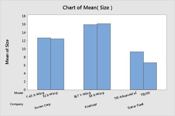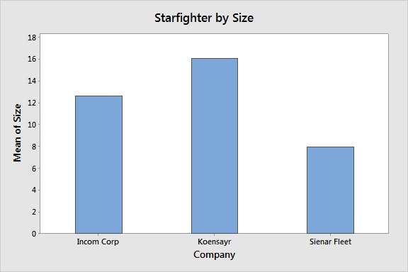 Let’s say we’re interested in which manufacturer builds the largest ships. We have a few different models, and each individual ship will have a slightly different length, so we are interested in the mean length for each. Let’s start at Graph > Bar Chart, but this time let’s change our drop-down to function of a variable. Choose Simple with One Y, and enter size as the graph variable and manufacturer as the categorical variable. Make sure that the function is listed as Mean, as we want to know who, on average, builds the largest starfighters. Minitab gives us the following graph: