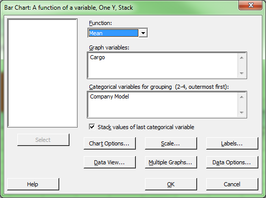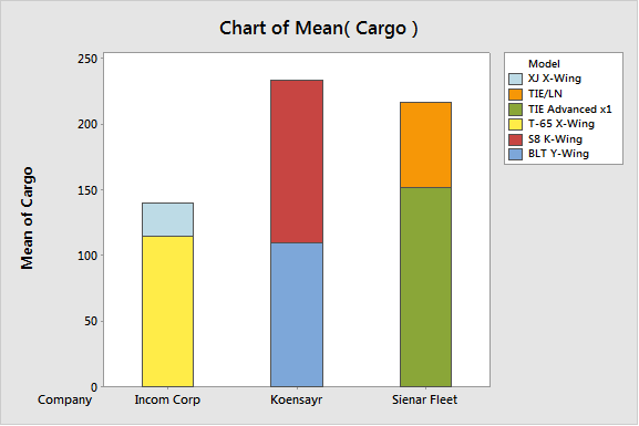 We have one option left, and that is the stacked chart. In addition to size, we are interested in how much cargo each fighter can hold. We want to see how much total cargo each company holds in their fleet. To do this, we can "stack" the cargo capacity for each ship and see who comes out on top. To do that, we can fill out our dialog as follows: