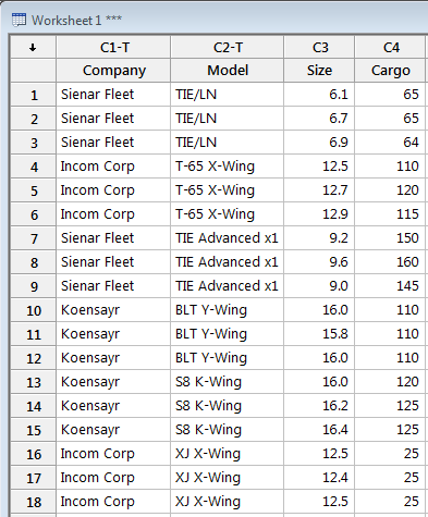 To illustrate this, I have a small data set investigating starfighters built in the Star Wars galaxy: