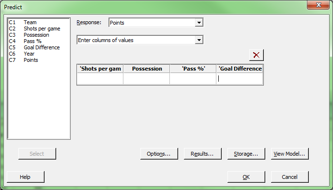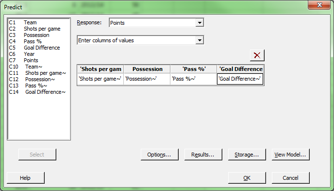 Here we are presented with a straightforward dialog that allows us to enter either individual values to predict on, or we can enter a column of values if we are interested in multiple predictions. For this analysis, we’re going to enter a column. Our worksheet contains the following table, which includes the statistics for each of our five teams, as well as a prorated goal differential, which will be used to forecast each team’s point total at the end of the year.