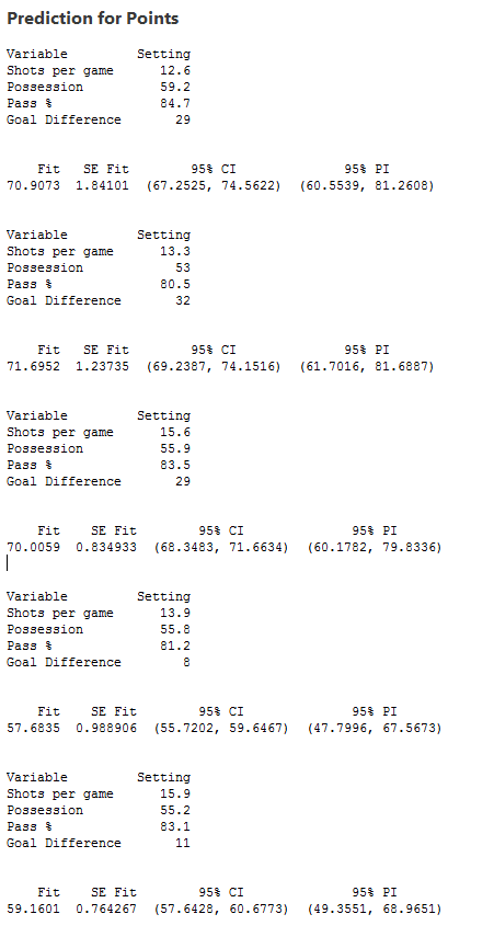 Right now, there are five teams who have a realistic chance at qualifying for the last two Champions League spots: Manchester United, Southampton, Arsenal, Tottenham, and Liverpool.We’re going to use Minitab’s Prediction dialog to forecast, based on some statistics, who will finish top 4 and qualify for next season’s UEFA Champions League. Using our statistical software, we ran a regression using data from the past five seasons, with Total Points as our response variable (in the Premier League, you receive 3 points for every win, and 1 point for every draw). Our predictors included a few different team-based statistics, namely Shots per game; Possession, which tracks the percentage of time a team controls the ball, pass completion percentage; and goal difference.