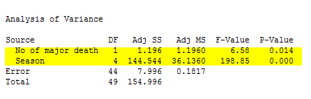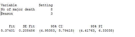 First, let’s look at the Analysis of Variance table. It shows you the effect of the terms in the model on the response. Using the p-value, we can determine whether the effect is significant. The general guideline is to use 0.05. If the p-value is smaller than 0.05, the effect of the term on the response is significant. The number of major deaths (p-value of 0.014) and season (p-value of 0) are both significant!