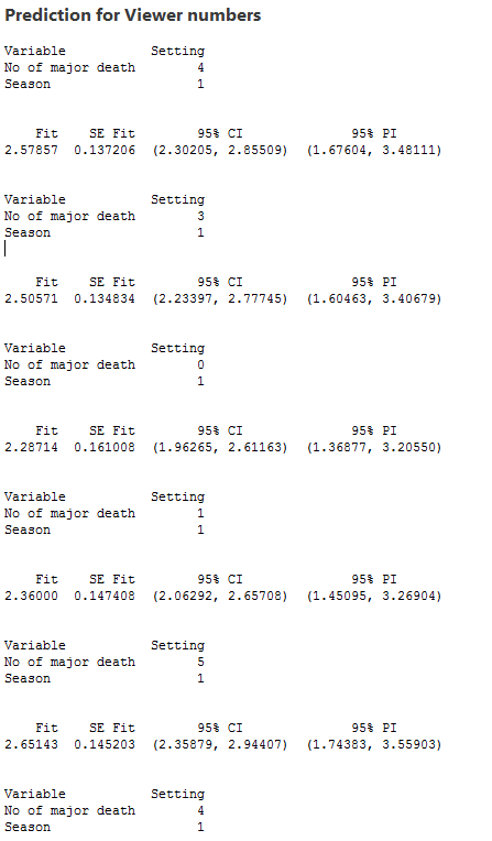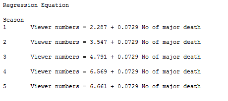 Looking at the equations, you will notice that all 5 equations have positive coefficients for the predictor “no of major death” with a positive constant. In other words, based on these equations, we can infer that as the number of major deaths increases, the viewing numbers will also increase. It would seem the show’s audience