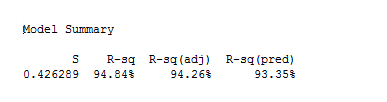 Next, looking at the model summary section, the R-square values are quite high, more than 90%. The R-square indicates the proportion or percentage of variation in the response that can be explained by the predictors. The higher the value, the better the model.