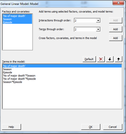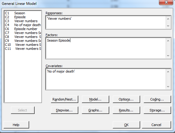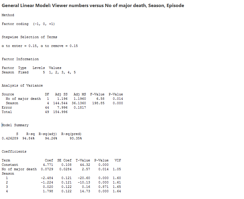 I am going to use the General Linear Model to analyse the data. This is because our variables include the season (1 to 5) and episode number (1 to 10), which are fixed and can be considered as categorical. In addition, we’ll consider the number of important characters who die in each episode as a covariate.