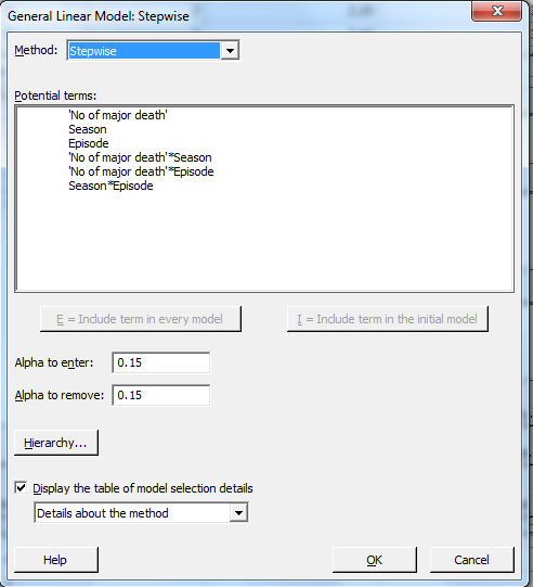 Next, I click “OK” to return to the first dialog box, and then click the “Stepwise” button to bring up this dialog box: