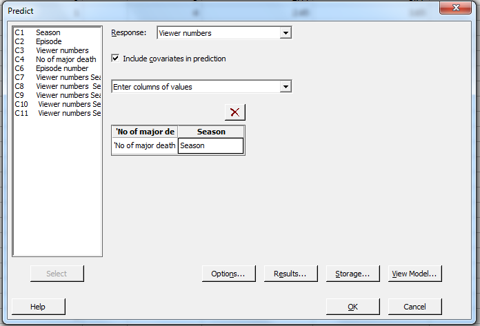 Stat > ANOVA > General Linear Model > Predict… to get some fitted values for the data. We can then compare these with the observed values in our original data set. Fill in the dialog box as shown below.