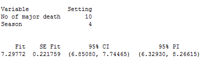 Season 3, episode 9 features the pivotal event “The Red Wedding.” With 8 key deaths, the highest number of casualties up to that point in the series, this episode had 5.22 million viewers. For this episode, our model delivered the following fitted values statistics.