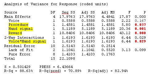 The alias structure of the original design indicated that the significant AD interaction (Voice*Hand signal) was confounded with two other 2-way interactions: EF and CG.