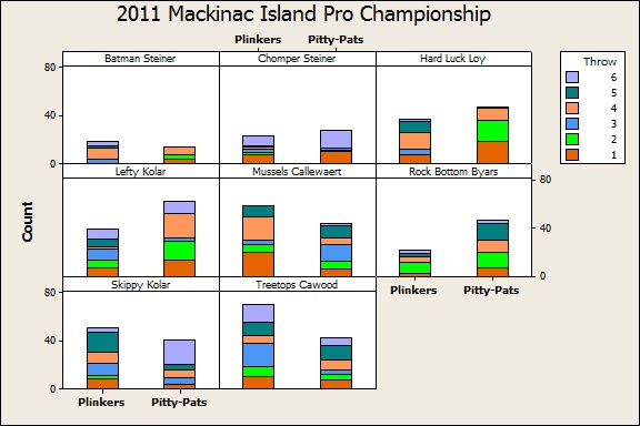 To help answer this profound question, I created a stacked bar chart in Minitab that shows the number of plinkers and pitty-pats on each throw for each pro finalist in last year's national competition.