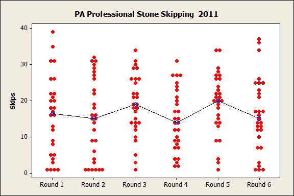 To find out, I recorded the results from last year’s Pennsylvania stone skipping tournament in Minitab Statistical Software and displayed the results in an individual value plot. There were 29 pro contestants. Each contestant got six tries to skip a stone, once in each round. How did they do?