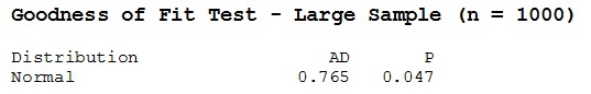 For the large sample (shown in the histogram of C1), the p-value (0.047) is less than alpha (0.05), so you reject the null hypothesis that the data are from a normally distributed population. You conclude that the data are not normal.