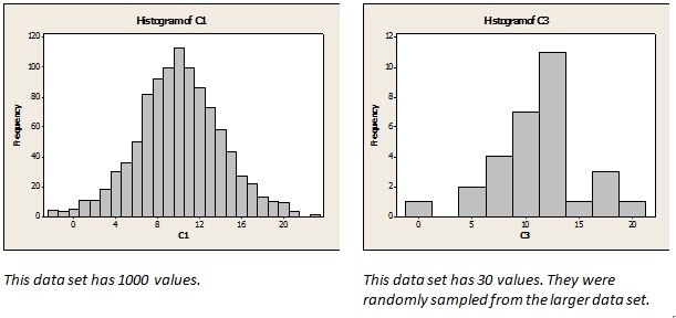 For the small sample (shown in the histogram of C3), the p-value (0.676) is greater than alpha (0.05), so there is not enough evidence to reject the null hypothesis that the data are from a normally distributed population. You assume the data are normal.