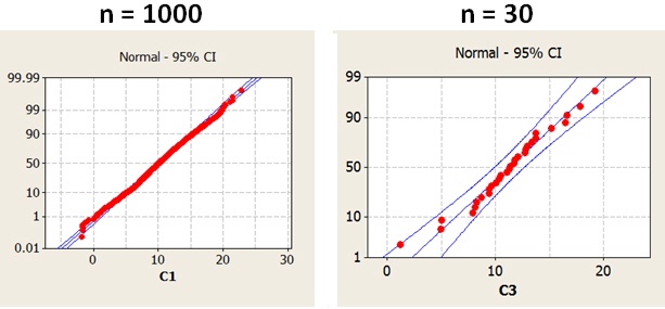 Here, the probability plot for the large data set shows the points following a fairly thin, straight line, which indicates that you can assume that the normal distribution is a good fit.