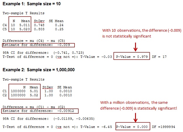 Look at the 2-sample t-test results shown below. Notice that in both Examples 1 and 2 the means and the difference between them are nearly identical. The variability (StDev) is also fairly similar. But the sample sizes and the p-values differ dramatically: