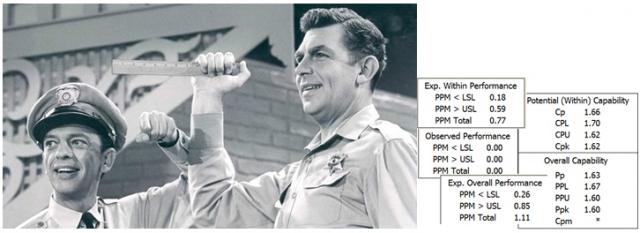 Sheriff Taylor: It really depends on the application, Barney, and the consequences of having parts fall outside of the specification limits. Some industries use a minimum requirement of 1.33 for capability indices. But if the consequences for customers are severe, 1.33 might not be high enough. If they're minor, a lower value might be okay.