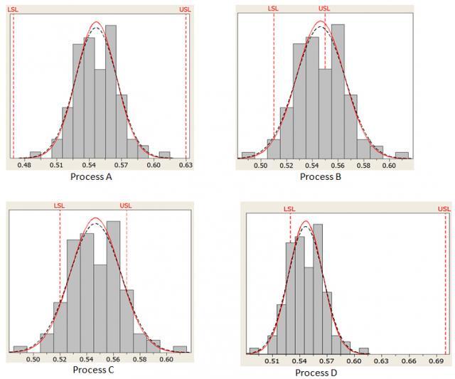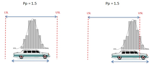 Sheriff Taylor: Well, Pp just tells you whether your process spread fits into your specification limits. But it doesn’t tell you anything about the actual location of your process. For example, both of these processes have the same Pp.