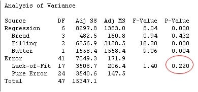 If the p-value for lack-of-fit is less than 0.05, there's statistically significant evidence that the model does not fit the data adequately. For this model, the p-value here is greater than 0.05. That means there's not sufficient evidence to conclude that the model doesn't fit well. That's a good thing.