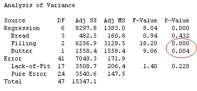 At the 0.1 level of significance, both Filling and Butter predictors are statistically significant (p-value < 0.1). What matters to a meat ant, it seems, is not the bread, but what's between it.