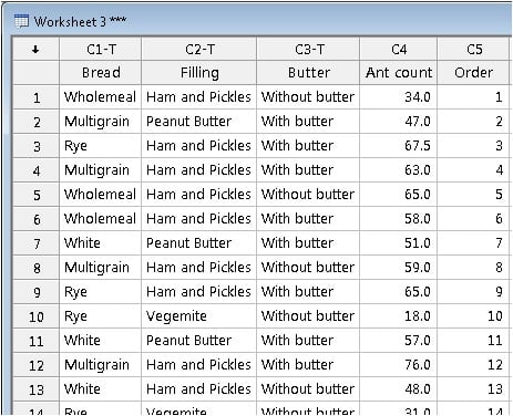 After coding and sorting, the combination of factor levels for each sandwich used for ant bait are easy to see in the worksheet, and the data values are arranged in the order that they were collected.
