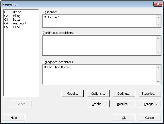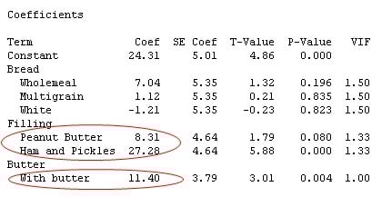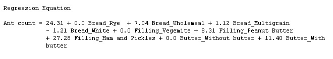 For example, using the equation above, the number of meat ants that you can expect to be attracted by a peanut butter sandwich, without butter, on white bread, is estimated at: 24.31 + 7.04(0) + 1.12(0) - 1.21(1) + 0.0(0) + 8.31(1) + 27.28(0) + 0.0(1) + 11.40(0) ≈ 31.41 ants. (You can have Minitab do these calculations for you. Simply choose Stat > Regression > Regression > Predict and enter the predictor levels in the dialog box.)