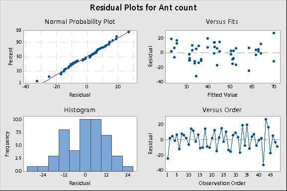 The R-squared (adj) value suggests this model explains about half of the variation of the ant count (47.35%). Not great—but not not bad for a linear regression model with only a few categorical predictors. For this particular analysis, the ANOVA output also includes a p-value for lack-of-fit.