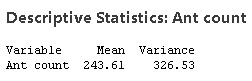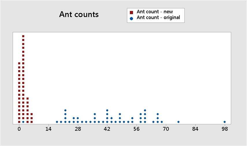 Let's go back, full-circle, to the original ant count data set from am.stat org, shown by the blue data values in the dotplot below).