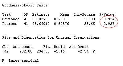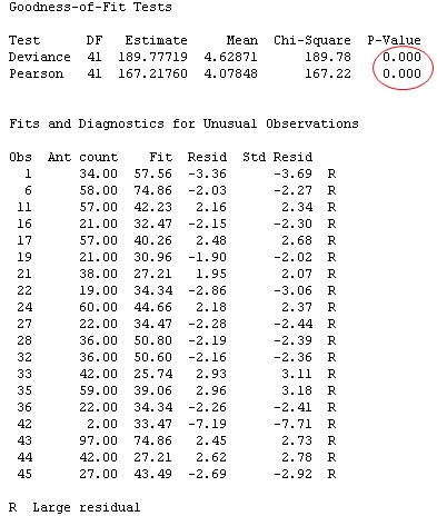 Now, if you re-run the Poisson regression analysis with this modified data, look what happens to the lack-of-fit statistics and unusual observations: