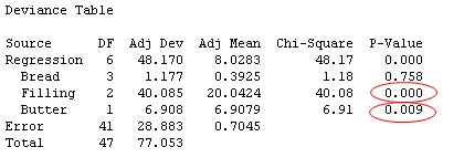 Filling and Butter are statistically significant at the 0.1 level—just as they were when using ordinary linear regression. But take a look at the regression equation: