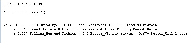 The regression equation is different for a Poisson model than for ordinary linear regression. For one thing, the estimated ant count response equals the exponentiated value of the Y' value given by the equation. For example, for a peanut butter sandwich on whole meal bread, with butter, the equation yields a Y' value of -1.508 - 0.061(1) + 1.099(1) + 0.670(1) = 0.2. But that's not the estimated ant count. The estimated ant count is exp (0.2) = e0.2 ≈ 1.22. (By the way, you can have Minitab perform this ugly number crunching for you: Choose Poisson Regression > Predict and fill in the predictor values for which you want a response estimate.)