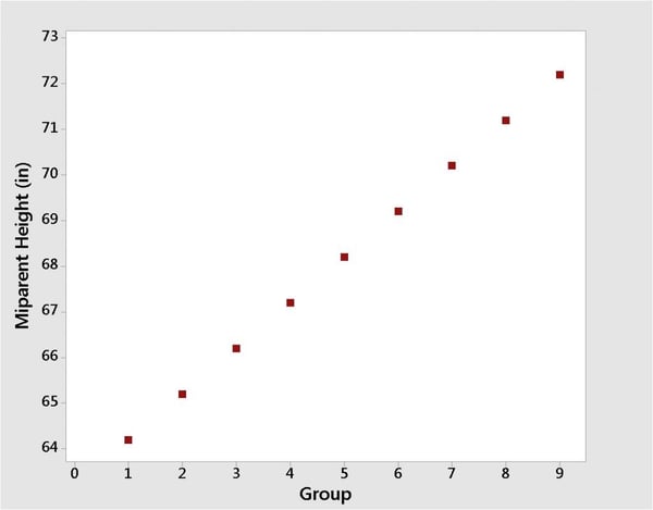 Galton was also keenly interested in heredity. In one experiment, he collected data on the heights of 205 sets of parents with adult children. To make male and female heights directly comparable, he rescaled the female heights, multiplying them by a factor 1.08. Then he calculated the average of the two parents' heights (which he called the “mid-parent height”) and divided them into groups based on the range of their heights. The results are shown below, replicated on a Minitab graph.