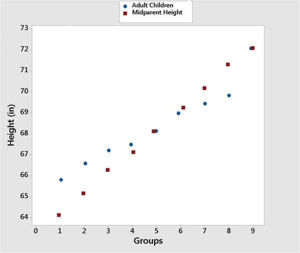 For each group of parents, Galton then measured the heights of their adult children and plotted their median heights on the same graph.