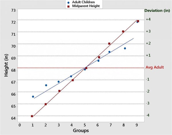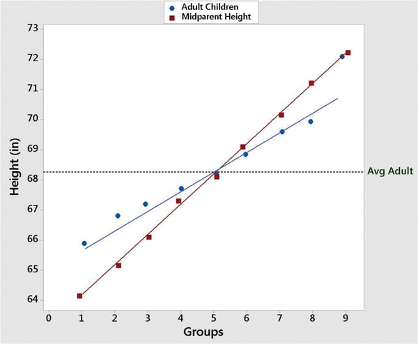 Based on these results, Galton concluded that as heights of the parents deviated from the average height (that is as they became taller or shorter than the average adult), their children tended to be less extreme in height. That is, the heights of the children regressed to the average height of an adult.