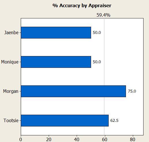 Overall, our appraisers correctly identified the “good” and “bad” samples about 60% of the time. That's just slightly better than what you’d expect by pure chance (50%). There’s definitely room for improvement in this appraisal system!