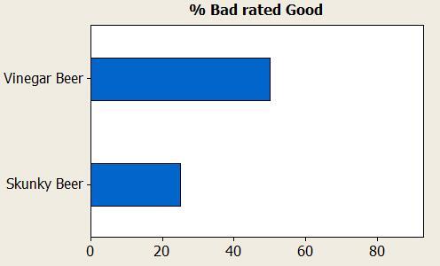 Morgan correctly identified every sample of defective beer (the % Bad rate Good chart indicates 0). When she did err, she mistook good beer for bad. That supports a possible carryover effect. So I checked the raw data. Sure enough, her two misclassifications of “bad” for “good” actually came immediately after she had sampled a skunky beer. Does old, flat beer leave a lingering bad taste in Morgan’s mouth? If so, to paraphrase Marie Antoinette (or Jean-Jacques Rousseau), “Let her eat rice cake!”