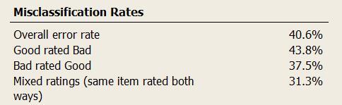 The bar charts of misclassifications, such as the %Bad rated Good (shown below), helps to clarify mixed ratings in your study.