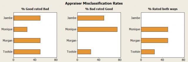 Jaenbe seems to mistake good beer for bad beer at about the same rate (50%) as she mistakes bad beer for good beer. Interestingly, although her ratings weren't very accurate, Jaenbe was the only appraiser who was completely self-consistent in her ratings (% Rated both ways chart). She seems to be marching to the beat of a different bartender.