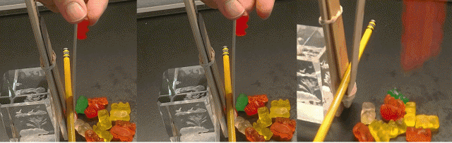 The position of the fulcrum and the position of the gummi bear are complicated because the gummi bear has to be above the fulcrum or it won't launch. The wider we make the fulcrum levels, the narrower the gummi bear levels have to be. I'm going to try the mid-point of the popsicle stick as the high point for both.