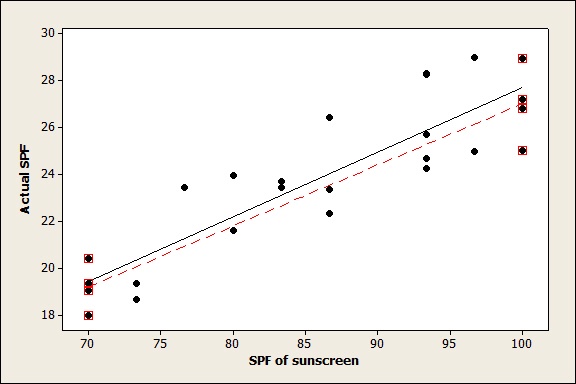 The Journal of the American Academy of Dermatology has published a report about how high SPF sunscreen can protect people who don't put apply enough sunscreen to achieve the advertised SPF. The authors conclude that, for high SPF suncreens, there is a linear relationship between the advertised SPF of a sunscreen and the actual SPF a person gets when they apply a thickness of 0.5 mg/cm2. We could test lots of special sunscreens with SPF values between 70 and 100 to get a good picture of what’s happening for all SPF values. Or, because the relationship is linear, we could collect data only about sunscreens with SPFs of 70 and 100 and get almost the exact same information.