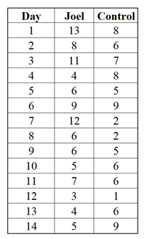 We can perform an experiment to determine if Joel is just a victim of the odds or if there is something that makes the birds target him. The generally low occurrence rate would make it difficult to collect data in a reasonable amount of time so we should perform an experiment to collect data. We could send Joel to a bird sanctuary for two weeks and record the number of times he is pooped on. Somebody of approximately the same size and appearance as Joel could be used as a control. Both Joel and the control should be dressed the same to ensure that birds are not targeting a particular color or clothing brand. The table below shows the hypothetical results of our little experiment.