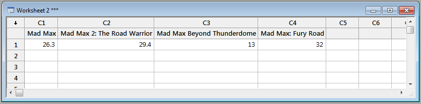 I then stacked the data by going to Data > Stack > Columns… and selecting columns C1-C4. Next, I relabeled column C1-T as “Film” and column C2 as % Chase.”