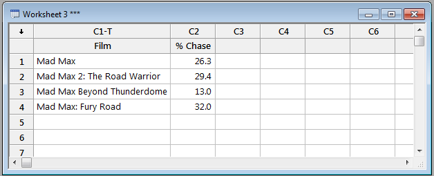 VonDerWerff presented an illustration of the percent of time individual Mad Max movies contained a chase scene based on data from the Internet Movie Data Base. I have recreated the illustration below as a bar chart using Minitab.