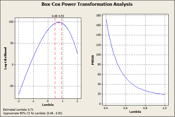 The results of this analysis indicate that the response variable should be raised by a constant of 0.75. A new model and residuals can be generated from this modified response variable and the assumptions can be checked.