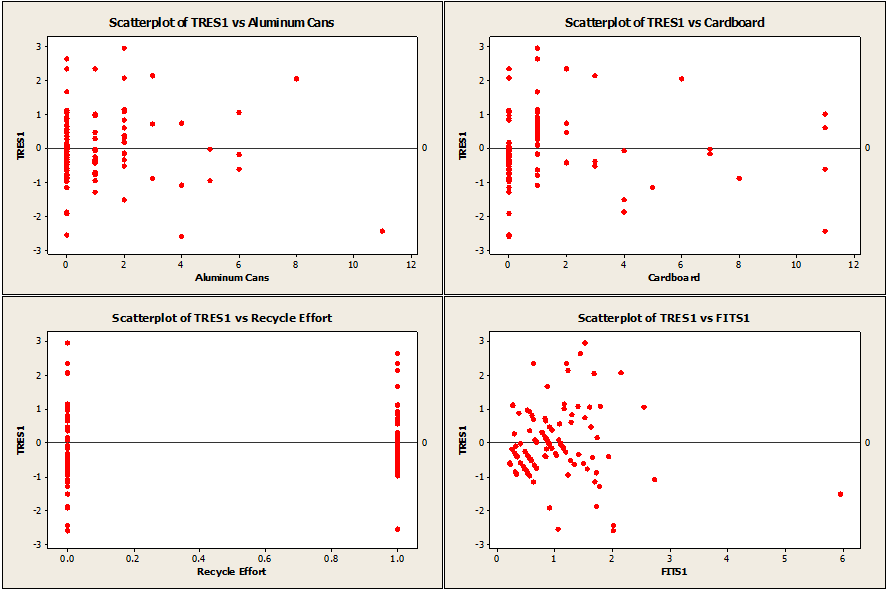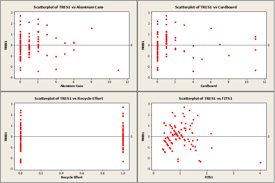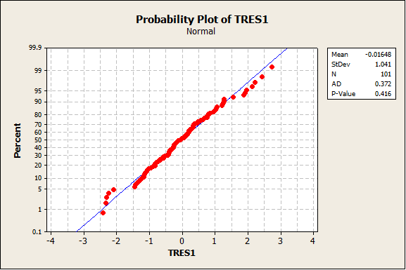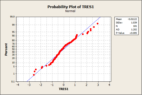 When looking over the scatter plots, it looks like these two assumptions are met. Checking the fourth assumption is just as easy. All that needs to be done is to run a normality test on the deleted T-residuals.