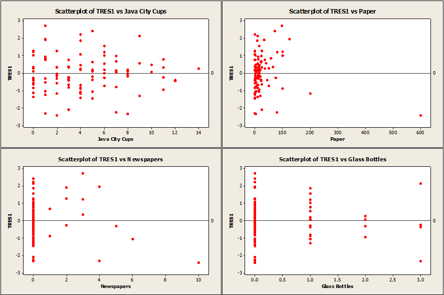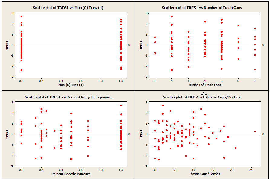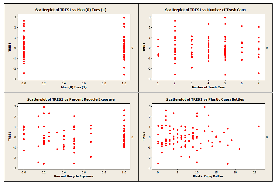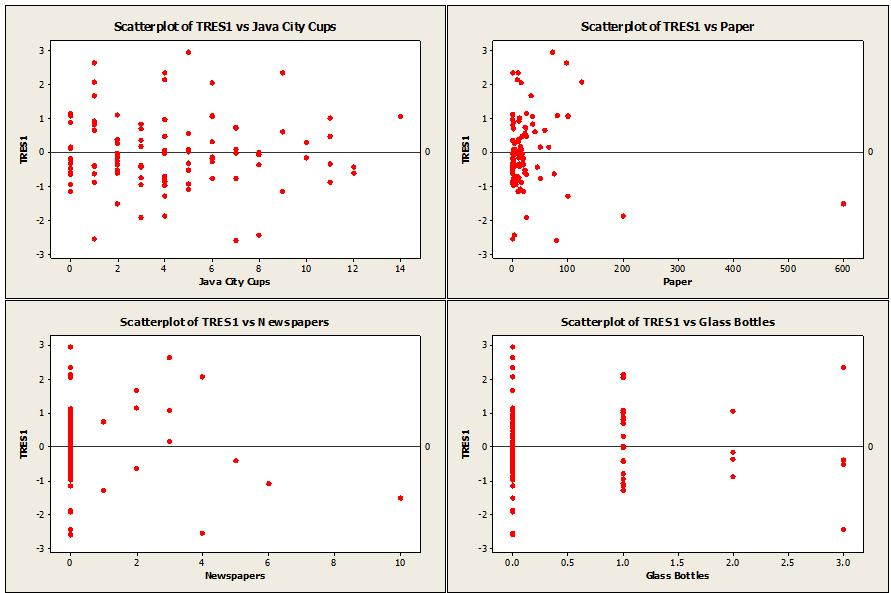 As with any Six Sigma process, the results of the work need to be evaluated. A simple two-sample T test could be performed, but it gives us a very limited amount of information – only whether there is a difference between the before and after improvement data. But what if we want to know if a certain item or factor affects the amount of recyclables disposed of? What if we wanted to know by how much of an effect important factors have? What if we want to create a predictive model that can estimate the weight of the recyclables without the use of a scale?