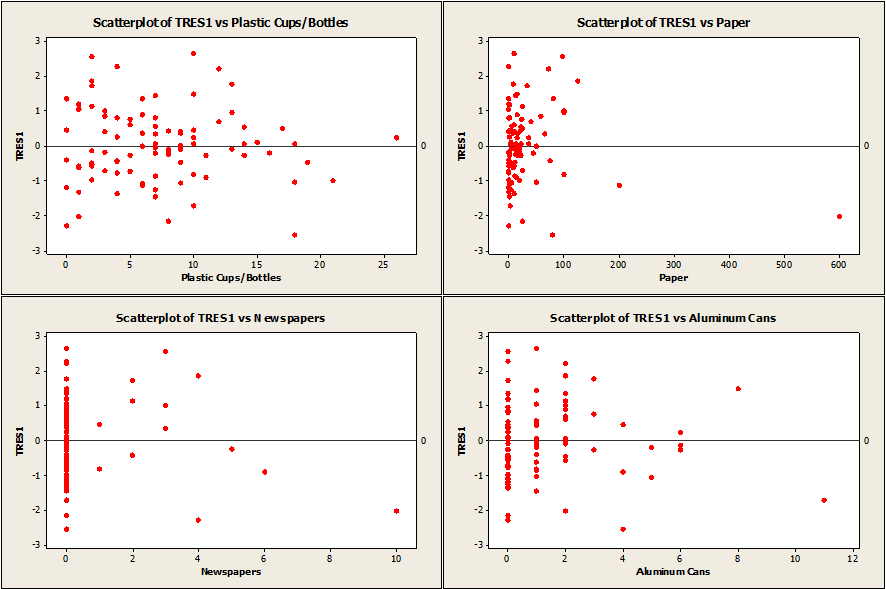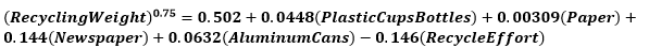 We also learned that of the 11 factors we started with, only five of them have a significant relationship with the weight of the recyclables. Plastic cups and bottles, sheets of paper, newspapers, and aluminum cans were found to be significant contributors to the total weight of recyclables disposed of in the trash. This is important to know, since it tells us what to focus on in future efforts.