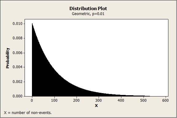 There are many different types of control charts, but for rare events, we can use Minitab Statistical Software and the G chart. Based on the geometric distribution, the G chart is designed specifically for monitoring rare events. In the geometric distribution, we count the number of opportunities before or until the defect (adverse event) occurs.