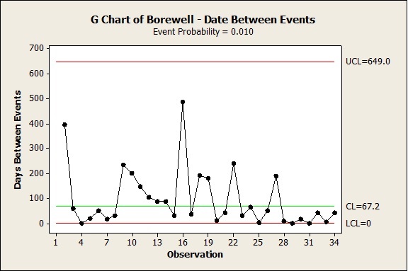Although the observations fall within the upper and lower control limits (UCL and LCL), the G chart shows a cluster of observations below the center line (the mean) after the 28th observation and before the 34th observation (the latest event). Overall, the chart indicates/detects an unusually high rate adverse events (borewell accidents) over the past decade.